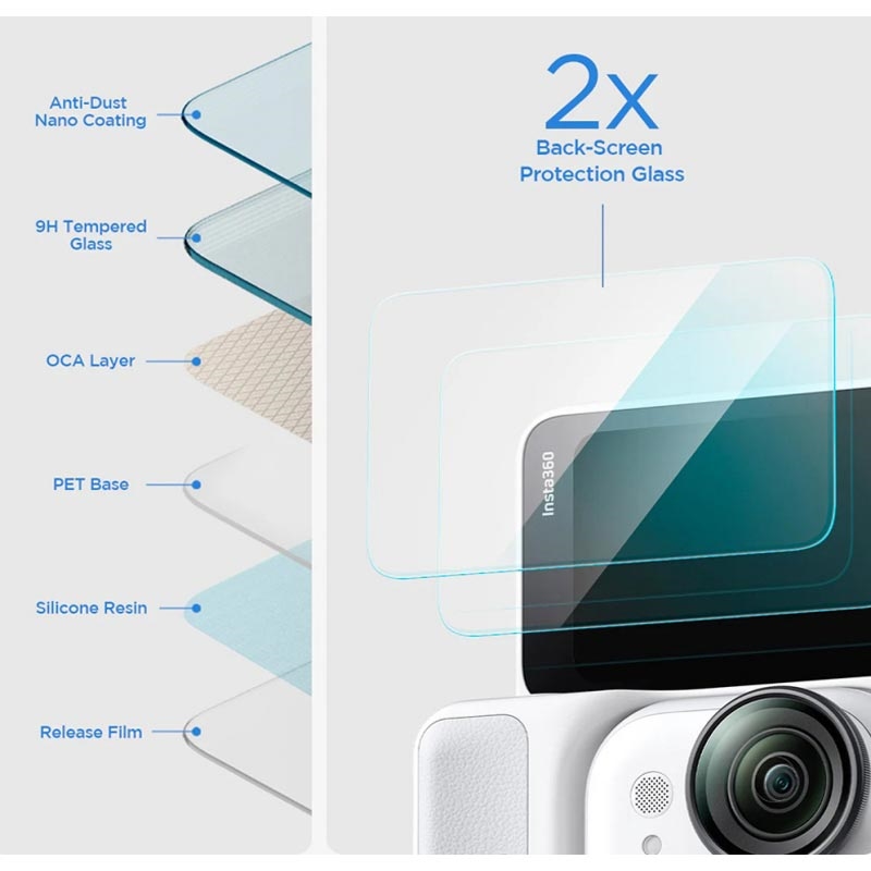 Hartowane szkło o grubości 0.3mm może się pochwalić branżowym standardem twardości 9H, który uodparnia je na zarysowania kluczami, monetami czy innymi przedmiotami w torebce czy kieszeni. Powłoka oleofobowa i gładkie krawędzie 2.5D ułatwiają czyszczenie i zapewniają komfortową obsługę Insta360 Go Ultra.