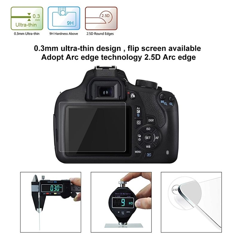 Chroń ekran swojego drogi aparat cyfrowy Canon EOS 1200D, 1300D przed uszzeniami i zarysowaniami z tą specjalnie przetwarzaną osłoną z hartowanego szkła odporną na zarysowania.