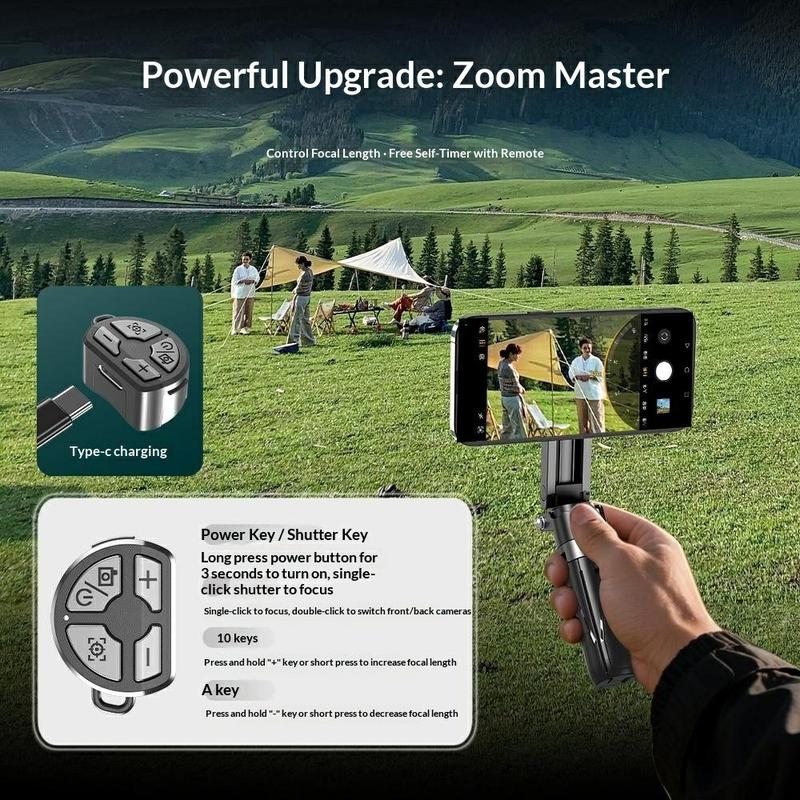 Dołączony pilot zdalnego sterowania Bluetooth 5.2 umożliwia wyzwalanie zdjęć i filmów z odległości do 10 m. Obsługuje przełączanie między przednią i tylną kamerą, powiększanie i ustawianie ostrości, zapewniając pełną kontrolę bez dotykania telefonu.