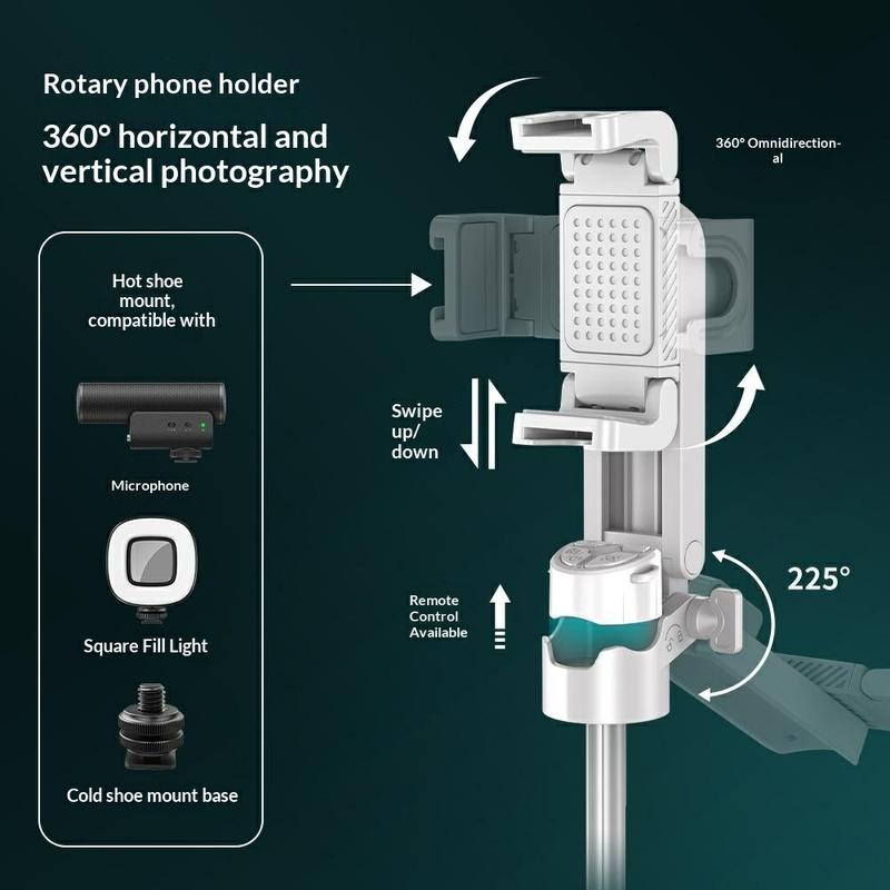 Uchwyt na telefon umożliwia obrót o 360° w pionie lub poziomie i oferuje regulację nachylenia w zakresie 225°. Ta elastyczność pozwala uchwycić kreatywne kąty dla vlogów, zdjęć grupowych i treści w mediach społecznościowych.