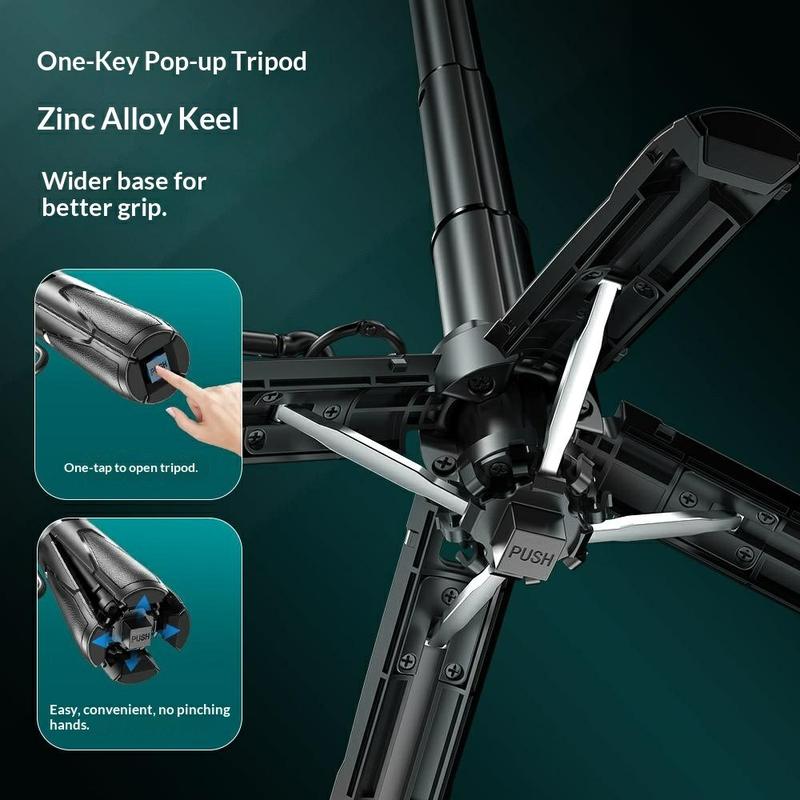Czteronożny statyw z konstrukcją nośną ze stopu aluminium zapewnia niezawodną stabilność na płaskich powierzchniach. Mechanizm wysuwania za jednym dotknięciem umożliwia szybką konfigurację, ułatwiając przełączanie między użytkowaniem ręcznym i stacjonarnym.