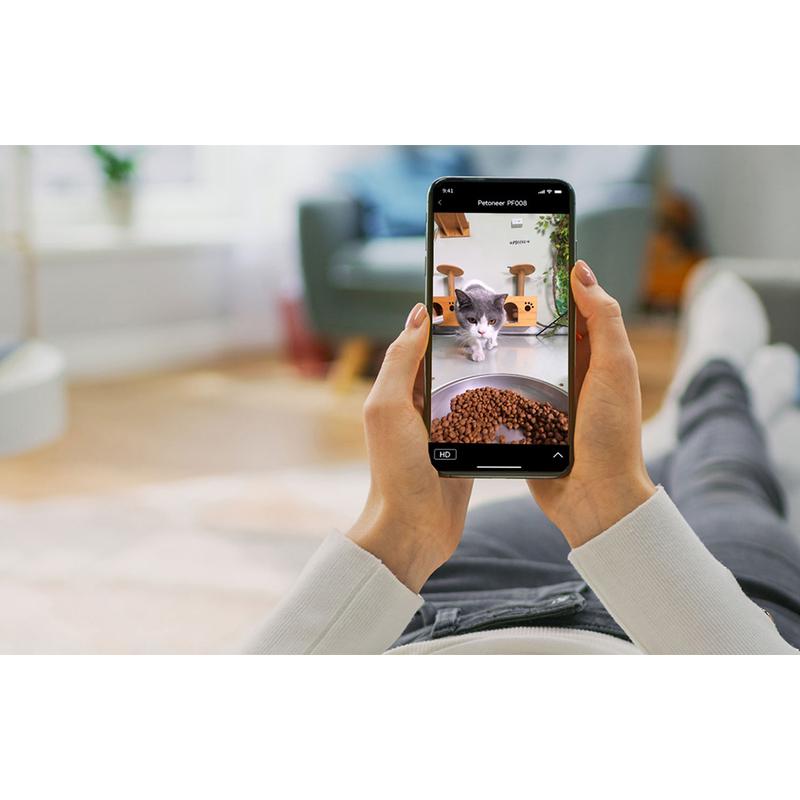 - Inteligentna kontrola porcji i harmonogramu: ustawianie pór posiłków i wielkości porcji za pomocą aplikacji Petoneer