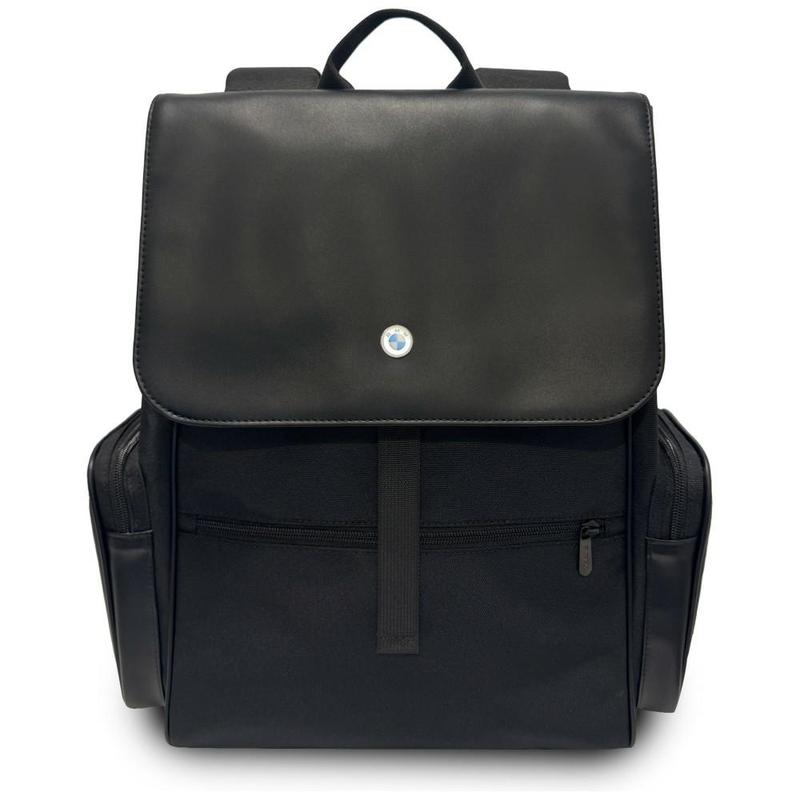 Plecak BMW z metalowym logo i bocznymi kieszeniami, przeznaczony do laptopów o przekątnej do 15 cali - nylonowy i PU plecak na laptopa