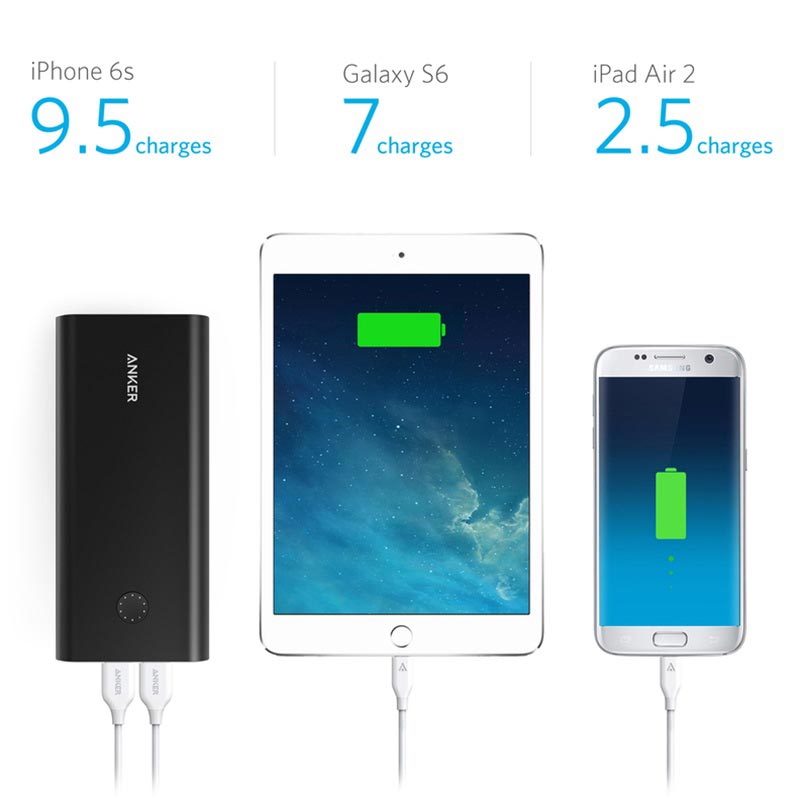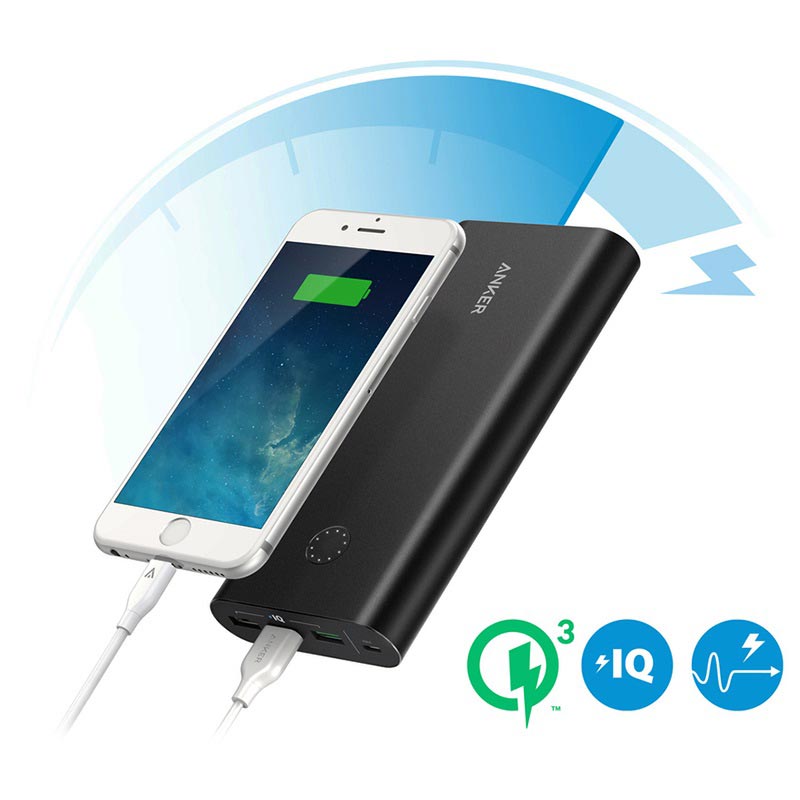 Wyposażony w ogromną pojemność 26800mAh i trzy port do ładowania USB, power bank PowerCore+ zapewni pełne naładowanie urządzenie gdziekolwiek jesteś. Zaawansowane technologie Quick Charge 3.0 z Anker's PowerIQ i VoltageBoost zapewnia pełne ładowanie wszystkich urządzeń do 3 amperów na port USB.