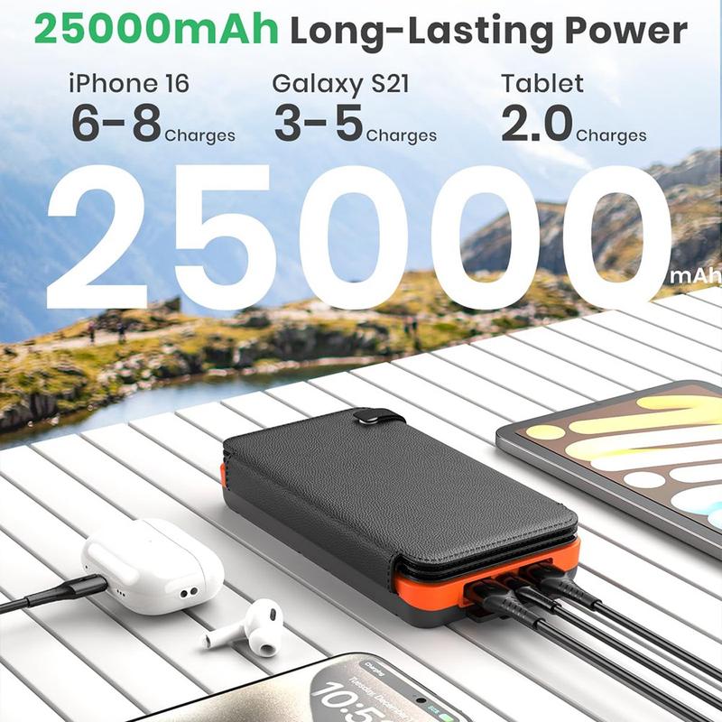 Zadbaj o zasilanie w każdym miejscu dzięki temu powerbankowi o pojemności 25000mAh, zaprojektowanemu z myślą o podróżach, biwakowaniu i awaryjnym zasilaniu. Dzięki baterii litowej o dużej pojemności i czterem składanym panelom słonecznym zapewnia niezawodne zasilanie smartfonów, tabletów, aparatów fotograficznych i innych urządzeń USB, nawet gdy nie masz dostępu do gniazdka elektrycznego. Kompaktowa, składana konstrukcja chroni panele i ułatwia przenoszenie w plecaku, a dołączony karabińczyk pozwala przymocować go do sprzętu, aby ładować urządzenia energią słoneczną podczas wędrówek lub wycieczek.