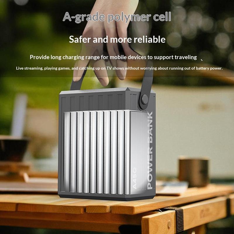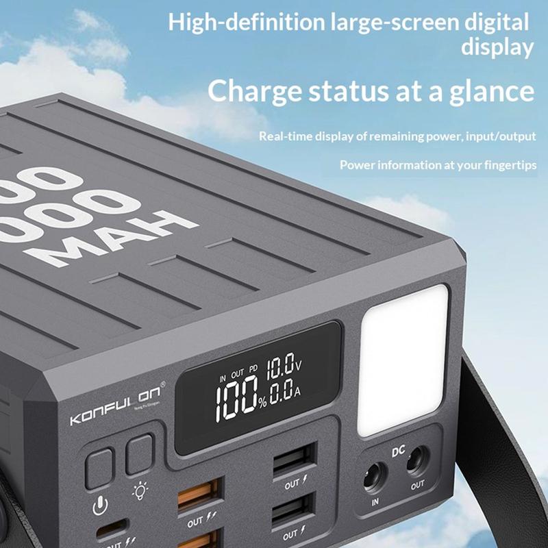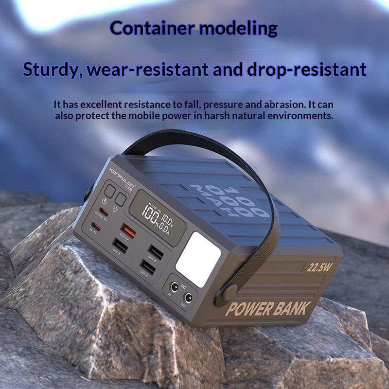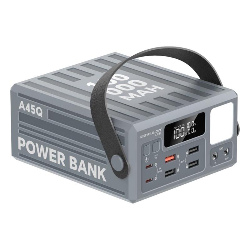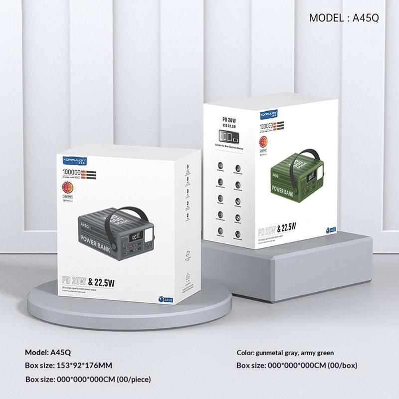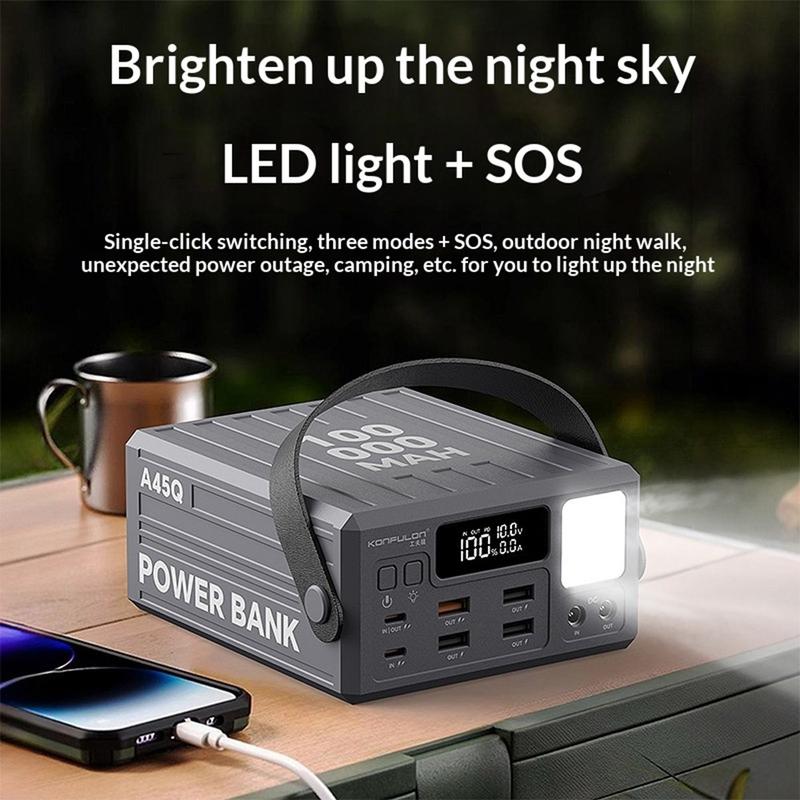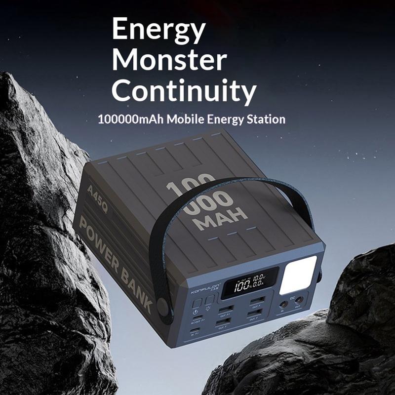 Zasilaj więcej urządzeń przez dłuższy czas dzięki powerbankowi Konfulon A45Q o pojemności 100000mAh. Ta stacja ładująca o dużej pojemności, zaprojektowana z myślą o podróżach, aktywnościach na świeżym powietrzu, biwakowaniu oraz jako zapasowe źródło zasilania w domu, zapewnia niezawodne magazynowanie energii i jest wyposażona w 7 portów wyjściowych, umożliwiających wygodne ładowanie wielu urządzeń jednocześnie.