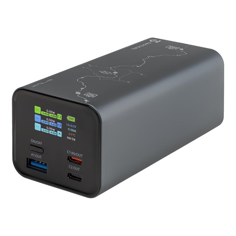 Dzięki 2 portom USB-C i 1 portowi USB-A zapewnia elastyczne ładowanie wielu urządzeń jednocześnie. Zintegrowany wyświetlacz TFT pokazuje poziom naładowania baterii, stan ładowania oraz moc wejściową i wyjściową w czasie rzeczywistym, dzięki czemu zawsze wiesz dokładnie, ile energii pozostało. Obudowa wykonana w całości ze stopu aluminium zapewnia trwałość, lepsze odprowadzanie ciepła i ekskluzywny wygląd, a charakterystyczny wzór inspirowany stylem taktycznym nadaje jej odważny i nowoczesny wygląd.