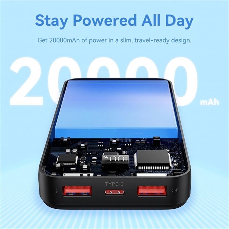Dzięki pojemności baterii wynoszącej 20000mAh ten power bank oferuje wystarczającą ilość zgromadzonej energii do wielokrotnego ładowania kompatybilnych urządzeń mobilnych. Jest to przydatne rozwiązanie na dłuższe dni spędzane z dala od ładowarki ściennej, niezależnie od tego, czy podróżujesz, pracujesz zdalnie, uczestniczysz w wydarzeniach, czy po prostu chcesz mieć pod ręką zapasowe źródło zasilania. Power banki o większej pojemności, takie jak ten, są szczególnie praktyczne dla użytkowników, którzy noszą przy sobie więcej niż jedno urządzenie lub potrzebują zasilania przez cały dzień.