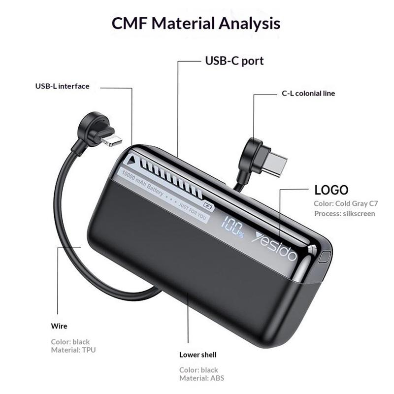 Powerbank Yesido YP99 o pojemności 10000mAh z funkcją szybkiego ładowania 22,5 W, wbudowanym kablem USB-C-Lightning i cyfrowym wyświetlaczem