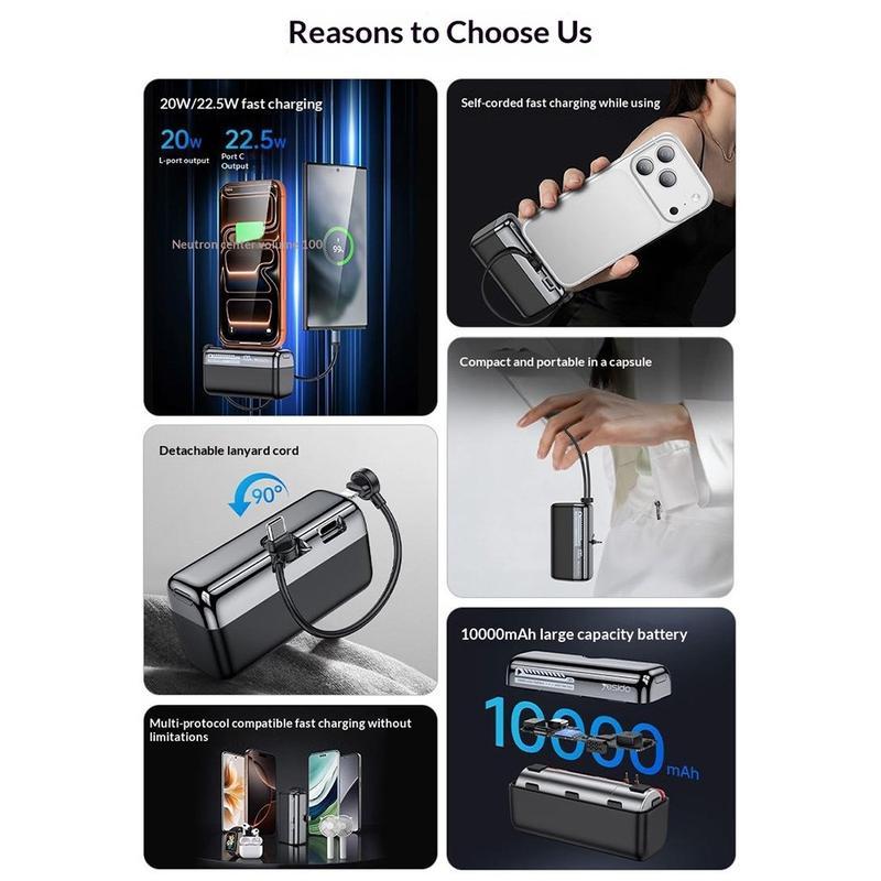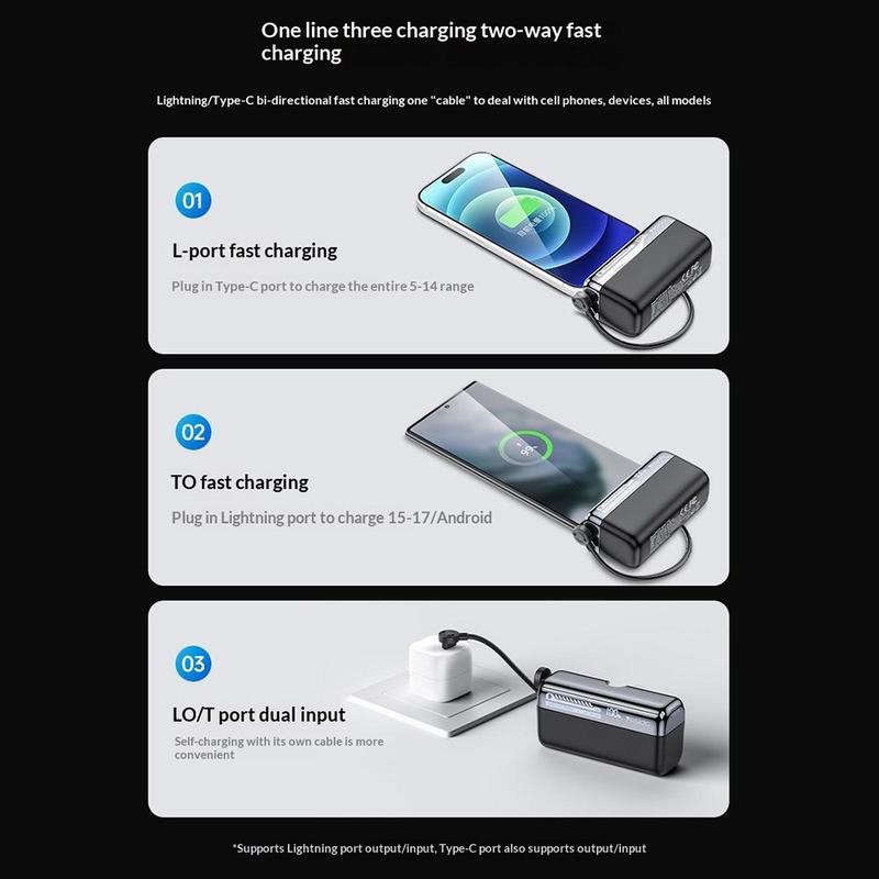 Ten power bank obsługuje wiele protokołów szybkiego ładowania, w tym PD, QC, AFC, SCP i FCP, dzięki czemu działa wydajnie z szeroką gamą urządzeń. Zapewnia moc wyjściową do 22,5 W przez USB-C i do 20 W przez USB-L, dzięki czemu nadaje się do szybkiego ładowania kompatybilnych telefonów, akcesoriów i innych przenośnych urządzeń elektronicznych. Szybkie ładowanie może być szczególnie przydatne, gdy potrzebujesz szybkiego doładowania w pracowite dni lub w podróży.