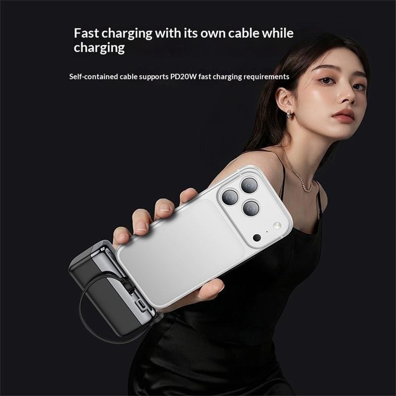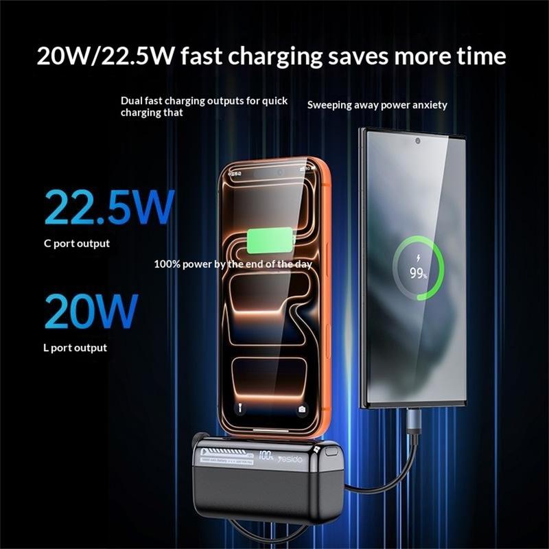 YESIDO YP99 zawiera zintegrowany kabel USB-C do Lightning, dzięki czemu nie musisz zawsze nosić ze sobą osobnego kabla. Wbudowany kabel w stylu smyczy posiada obrotową wtyczkę o kącie 90 stopni i może również służyć jako podstawka do telefonu, umożliwiająca wygodniejsze oglądanie bez użycia rąk podczas ładowania. Dzięki temu power bank jest szczególnie praktyczny podczas dojazdów do pracy, podróży lub codziennego użytkowania, gdy ważne jest ograniczenie ilości akcesoriów do minimum.