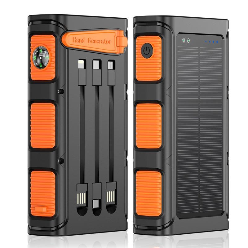 Przenośna ładowarka słoneczna z korbką ręczną 30000mAh - przenośna ładowarka outdoorowa z funkcją szybkiego ładowania PD 20 W, latarką, alarmem SOS, kompasem i wbudowanymi kablami