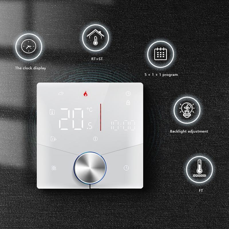 Model BHT-009GCLW obsługuje wiele metod sterowania, w tym WiFi, Modbus i funkcję karty pokojowej, dzięki czemu nadaje się do szerokiego zakresu instalacji i potrzeb użytkowników. Dzięki integracji z inteligentnym domem współpracuje z Amazon Echo, Google Home i Tmall Genie, umożliwiając wygodne sterowanie głosowe. Obsługuje również tworzenie lokalnych grup i udostępnianie urządzeń, co ułatwia zarządzanie wieloma termostatami w różnych pomieszczeniach lub strefach.