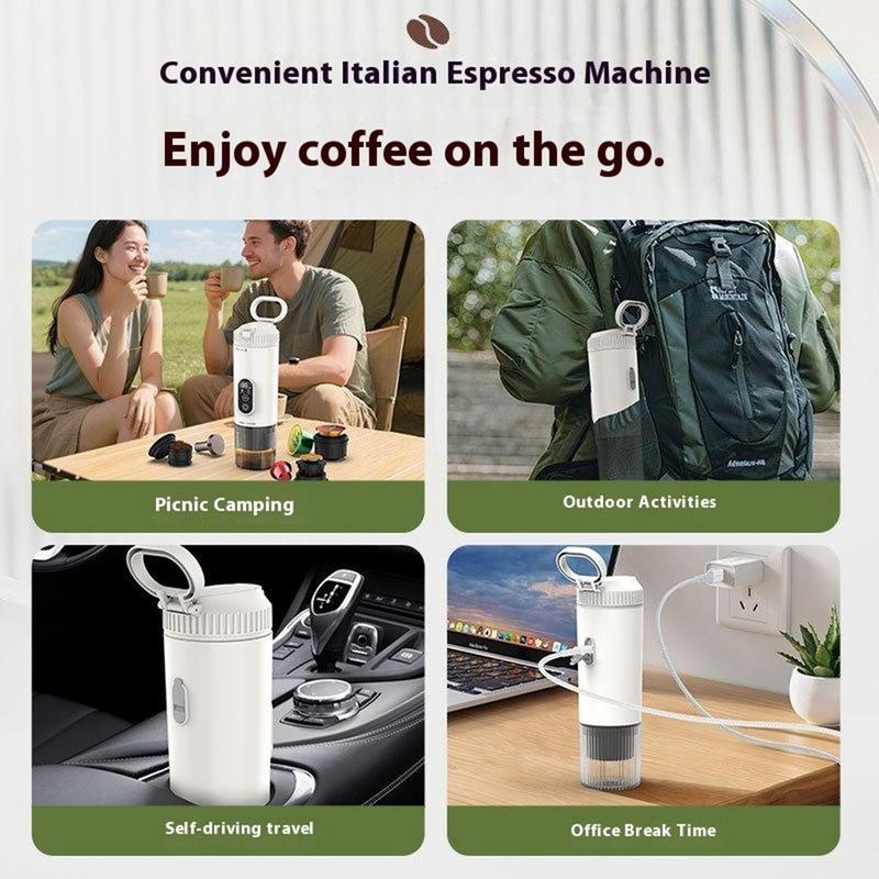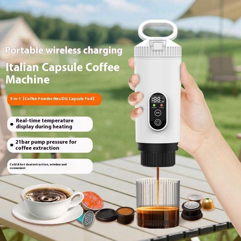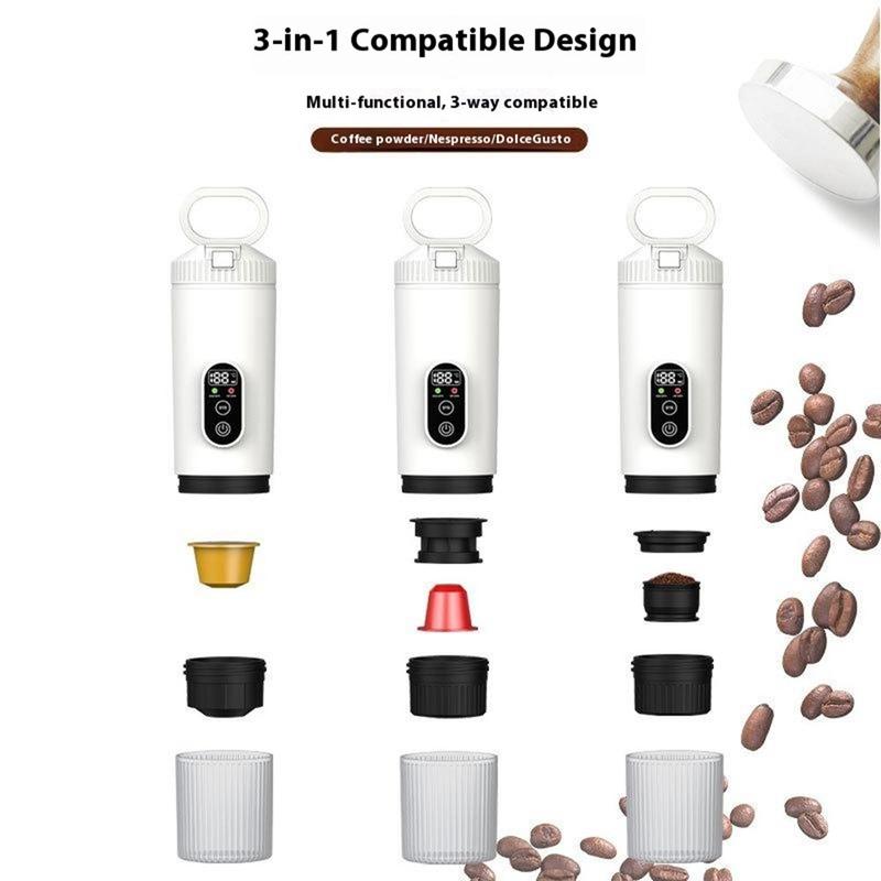 Przenośny ekspres do kawy 3 w 1 - bezprzewodowy elektryczny ekspres do kawy na kapsułki z akumulatorem 7500 mAh do samochodu, domu i na zewnątrz - kompatybilny z kapsułkami Nespresso, DolceGusto, kawą w proszku