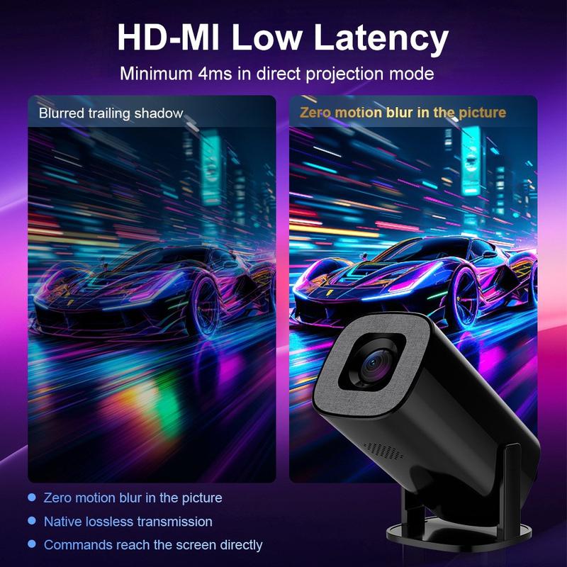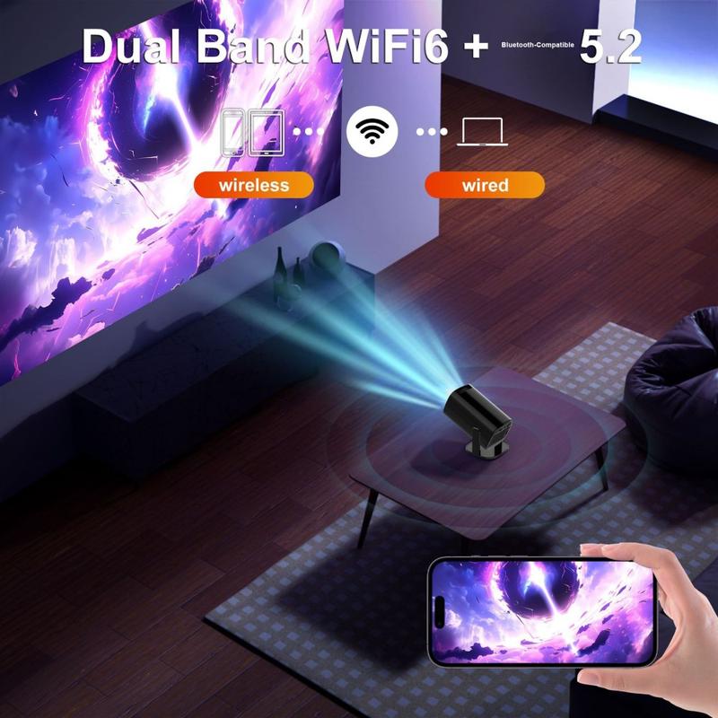 Konfiguracja jest szybka i bezproblemowa dzięki automatycznej korekcji zniekształceń trapezowych (30%) i czteropunktowej regulacji, które pomagają wyrównać obraz, nawet jeśli projektor nie jest idealnie wycentrowany. Dwuzakresowe WiFi 6 i kompatybilność z Bluetooth 5.2 zapewniają płynne połączenia bezprzewodowe do przesyłania ekranu, głośników i słuchawek, a konstrukcja o niskim poziomie hałasu (<25 dB w odległości 1 m) pozwala skupić się na oglądanym materiale.