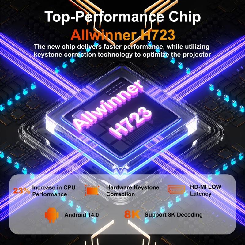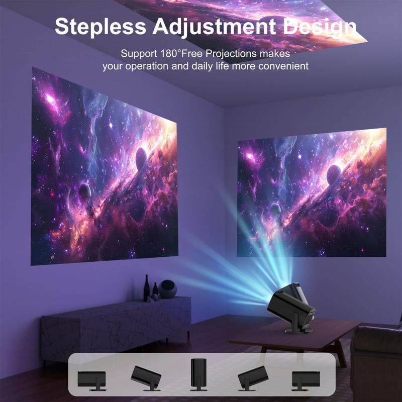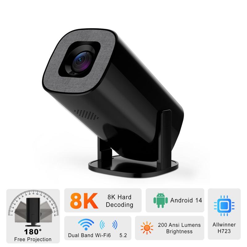 Przenośny projektor V1 z systemem Android 14 (200 ANSI) - rozdzielczość natywna 720p, automatyczna korekcja zniekształceń trapezowych, pochylenie 180°, dwuzakresowe WiFi 6 i Bluetooth 5.2, 1 GB/8 GB
