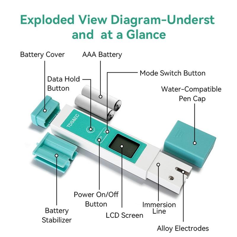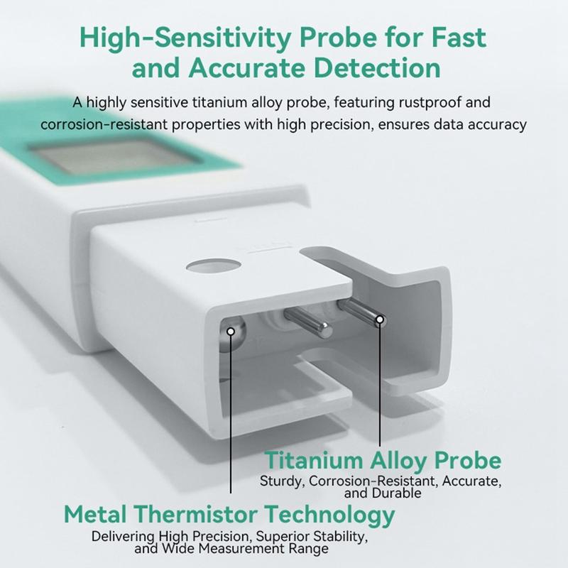 Tester jakości wody A13 zapewnia dokładne odczyty EC (przewodności elektrycznej), TDS (całkowitej zawartości rozpuszczonych substancji stałych) i temperatury wody, dając pełny obraz jakości wody pitnej w domu lub w podróży.