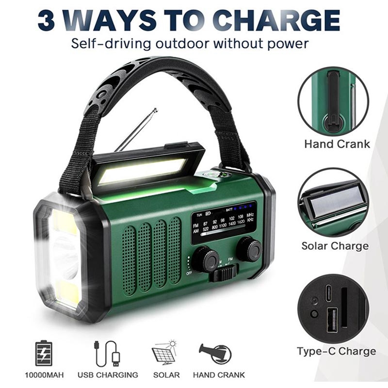 - Wielofunkcyjne radio ratunkowe: Obsługuje częstotliwości AM (520-1710 kHz), FM (87-108 MHz) i NOAA (162,400-162,550 MHz), zapewniając dostęp do ważnych aktualizacji i informacji.