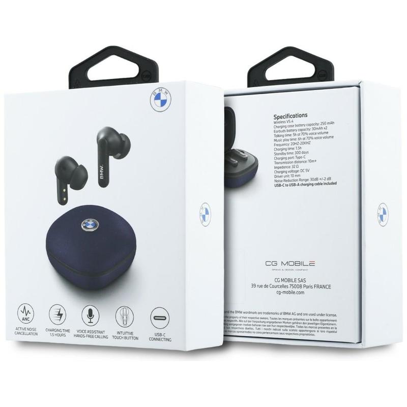 Słuchawki bezprzewodowe BMW Leather Metal Logo ENC z obsługą dotykową - Bluetooth 5.4, asystent głosowy, etui ładujące USB-C