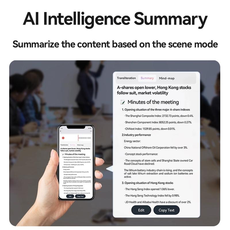 - Transkrypcja z wykorzystaniem sztucznej inteligencji: Połączenie z aplikacją AIREC-APP przez Bluetooth 5.3 w celu transkrypcji i tłumaczenia w czasie rzeczywistym w 188 językach, obsługiwanych przez ChatGPT.