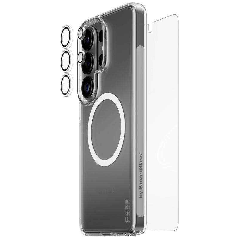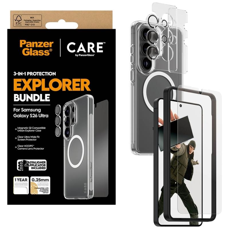 Zapewnij swojemu Samsungowi Galaxy S26 Ultra pełną ochronę za jednym zamachem dzięki zestawowi CARE by PanzerGlass 3-in-1 Explorer Bundle. Ten zestaw typu „wszystko w jednym” łączy w sobie ultra szeroką osłonę ekranu, przezroczystą osłonę obiektywu aparatu oraz wytrzymałe przezroczyste etui, dzięki czemu Twój telefon jest chroniony od przedniej szyby po moduł aparatu i tył. Stworzony z myślą o codziennym życiu w mieście i weekendowych przygodach, został zaprojektowany tak, aby wytrzymać upadki, zadrapania i uderzenia, jednocześnie zachowując oryginalny wygląd telefonu.