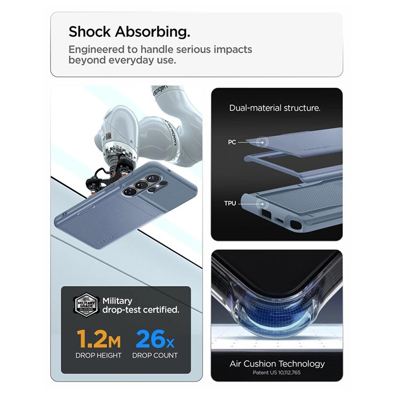 Ten pokrowiec Spigen Slim Armor CS oferuje najwyższej klasy ochronę Samsung Galaxy S26 Ultra przed obiciami, ponieważ spełnia standardy Military Grade Drop Protection, oraz posiada technologie MIL-STD 810G-516.6 i Air Cushion. Pokrowiec Spigen Slim Armor CS pozwala przechowywać do dwóch kart, dzięki wysuwanemu otworowi, który znajduje się na tyle pokrowca.