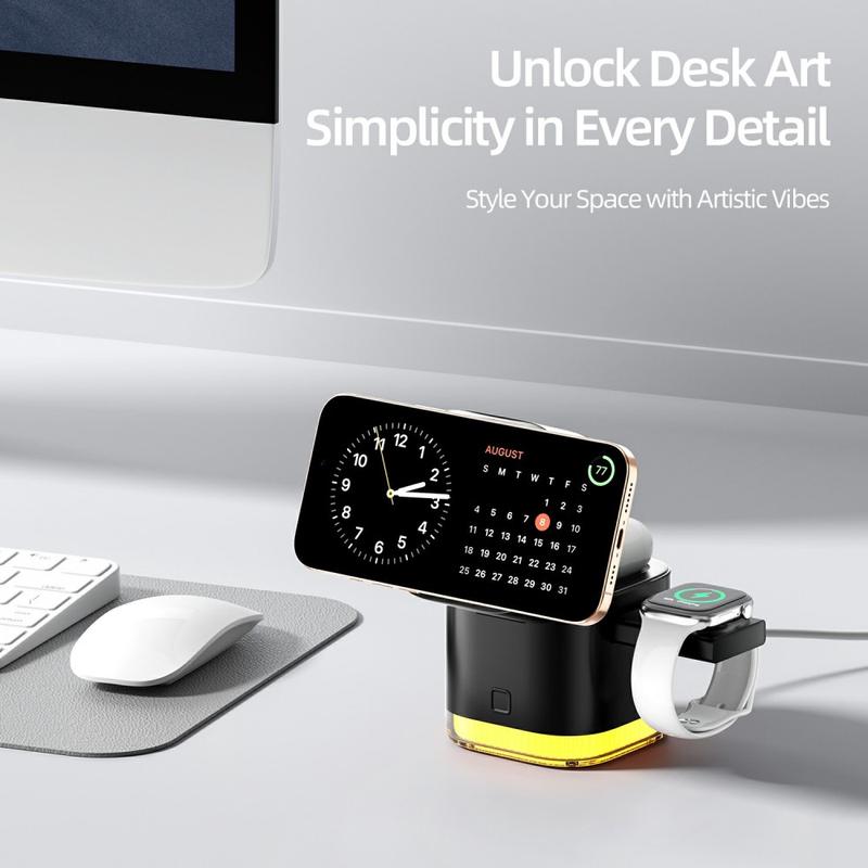 Ta ładowarka zapewnia wygodę, moc i organizację w jednym eleganckim urządzeniu. Dzięki ładowaniu wielu urządzeń, inteligentnemu wyrównaniu, wbudowanemu kablowi i oświetleniu otoczenia, zmniejsza bałagan, oferując jednocześnie niezawodne szybkie ładowanie w dowolnym miejscu.