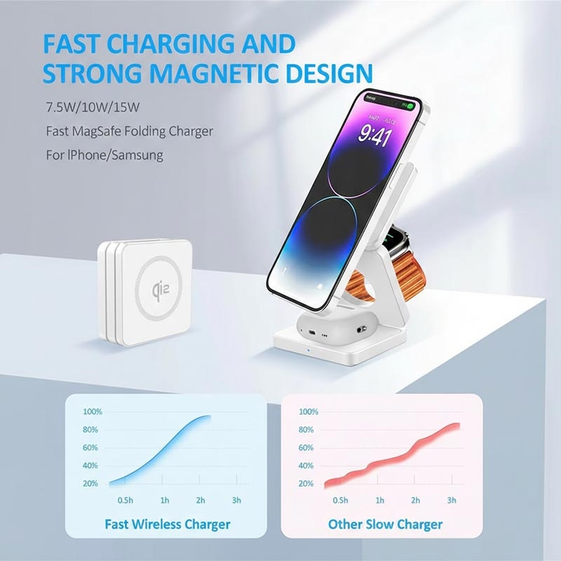 - Bezprzewodowe ładowanie 3 w 1 telefonu, zegarka Apple Watch i słuchawek dousznych