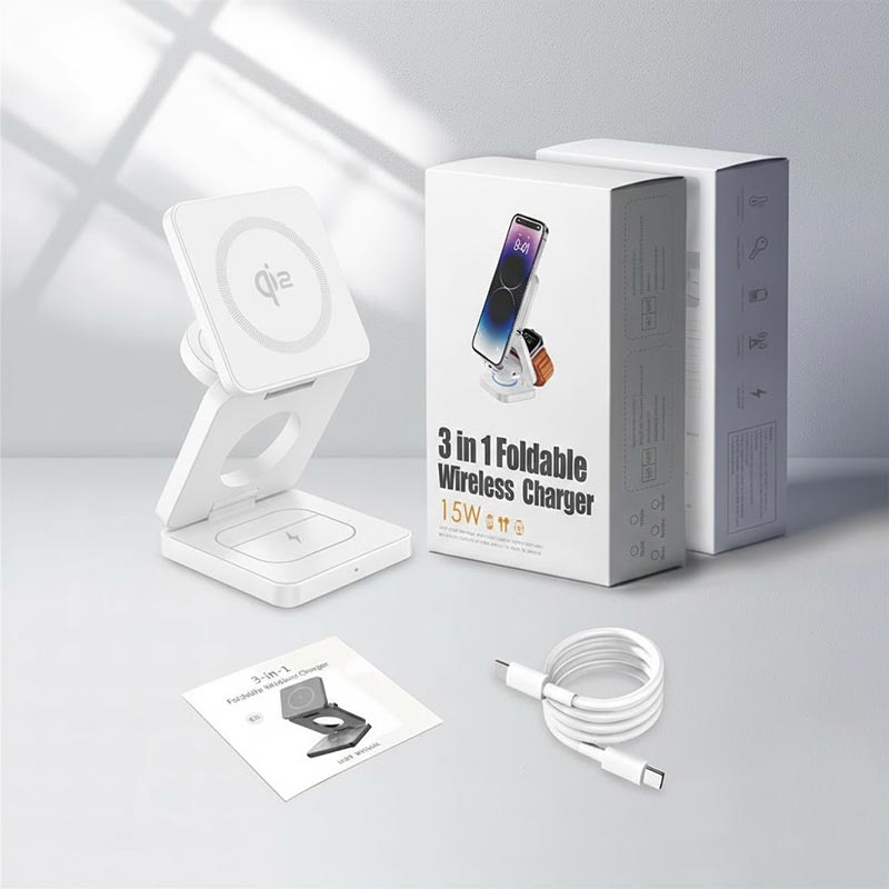 Składana magnetyczna podstawka do ładowania bezprzewodowego Qi2 15 W 3 w 1 - do iPhone'a, Apple Watch i AirPods