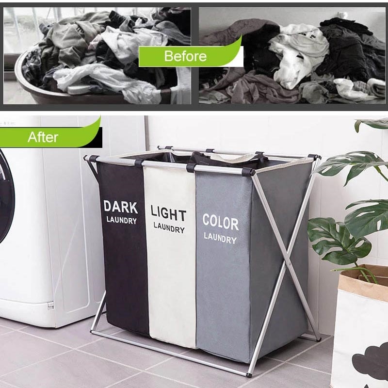 Ten składany 3-komorowy kosz na pranie pomaga uporządkować i oddzielić ubrania bez wysiłku. Dzięki trzem oznaczonym przegródkom i mocnej aluminiowej ramie, brudne pranie jest posortowane i starannie przechowywane, dodając jednocześnie czystego i nowoczesnego wyglądu do domu.