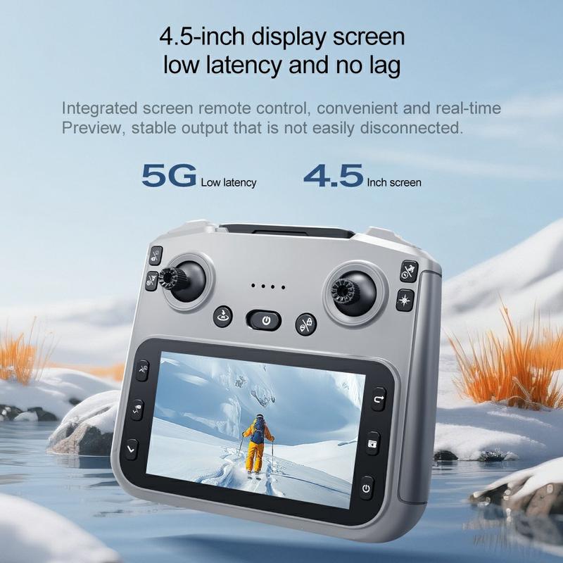 - Transmisja FPV 5G WiFi zapewnia podgląd obrazu w czasie rzeczywistym bezpośrednio na wbudowanym 4,5-calowym wyświetlaczu pilota.