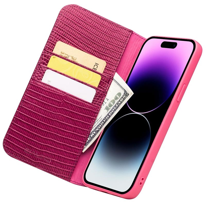 - Wysokiej jakości etui-portfel ze skóry na iPhone 14 Pro, marki Qialino