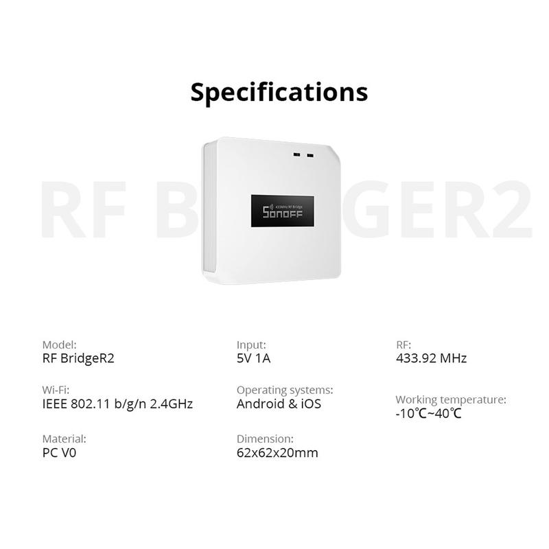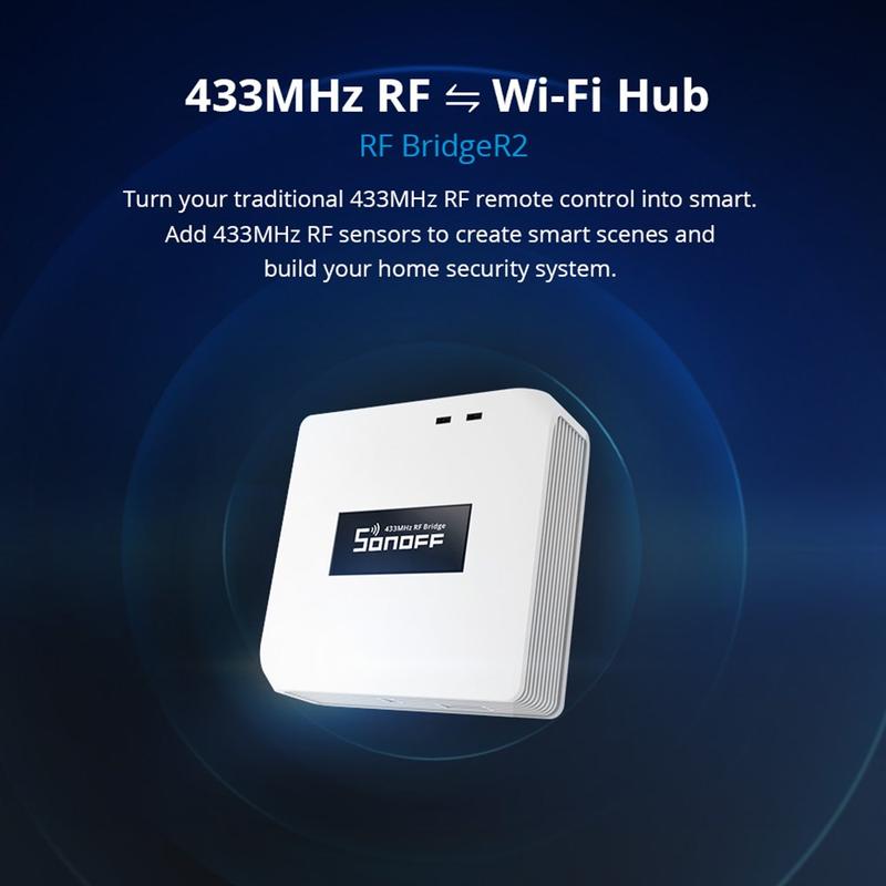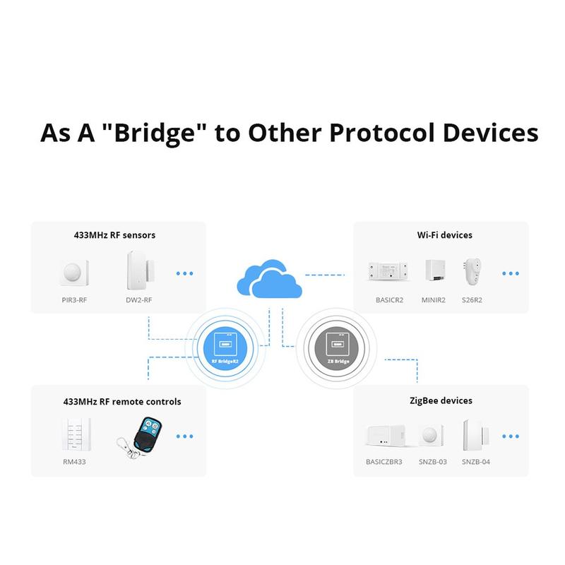 Wprowadź swoje urządzenia RF 433MHz do inteligentnego domu WiFi dzięki Sonoff RF BridgeR2. To kompaktowe inteligentne centrum działa jako pomost między czujnikami i pilotami RF 433,92 MHz a siecią WiFi, umożliwiając zarządzanie kompatybilnymi urządzeniami z telefonu za pomocą aplikacji eWeLink. Użyj go, aby uprościć sterowanie wieloma urządzeniami RF, tworzyć scenariusze automatyzacji i otrzymywać powiadomienia o zdarzeniach związanych z bezpieczeństwem, takich jak otwarcie drzwi lub wykrycie ruchu.