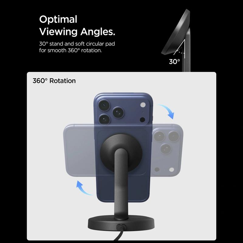 Ergonomiczna podstawka ma stały kąt nachylenia 30°, który zapewnia wygodną pozycję podczas oglądania, dzięki czemu idealnie nadaje się do czytania wiadomości, prowadzenia rozmów wideo lub oglądania treści podczas ładowania. Ładowarka obsługuje zarówno orientację pionową, jak i poziomą, zapewniając elastyczność podczas przeglądania, streamowania lub korzystania z aplikacji bez użycia rąk. Jej minimalistyczny design łatwo komponuje się z biurkami, szafkami nocnymi i wyposażeniem biurowym.