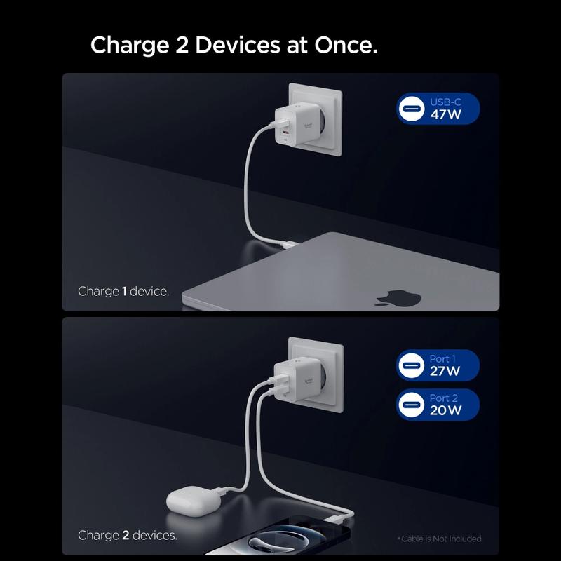 Spigen Essential EE472EU to potężna i kompaktowa ładowarka ścienna GaN Pro zaprojektowana do szybkiego ładowania dwóch urządzeń jednocześnie przy zachowaniu bezpiecznego, inteligentnego zarządzania energią. Wyposażona w dwa porty USB-C, automatycznie dostosowuje moc wyjściową w zależności od liczby podłączonych urządzeń: pojedyncze urządzenie może pobierać pełne 47 W z USB-C(1), podczas gdy dwa podłączone urządzenia otrzymują wydajną wspólną moc wyjściową 27 W + 20 W.