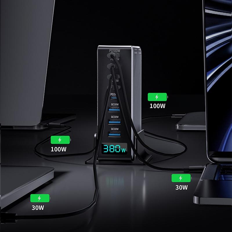 Zasil całą swoją konfigurację dzięki wysokowydajnej stacji ładującej GaN o mocy 380W, stworzonej z myślą o nowoczesnych domach i biurach. Dzięki 8 portom (5x USB-C + 3x USB-A) i cyfrowemu wyświetlaczowi zasilania, możesz ładować laptopy, telefony, tablety, słuchawki, power banki i inne urządzenia w tym samym czasie, jednocześnie utrzymując porządek na biurku. Technologia GaN pomaga zapewnić wysoką wydajność w kompaktowej formie, a wbudowane zabezpieczenia pomagają utrzymać stabilne i niezawodne ładowanie.