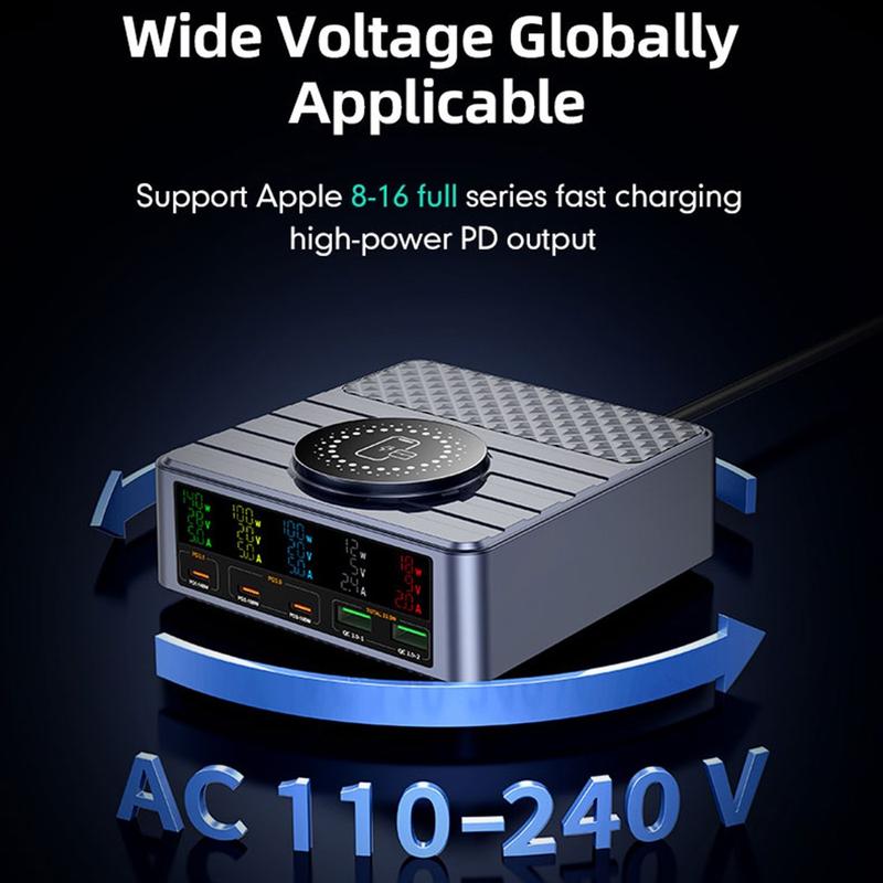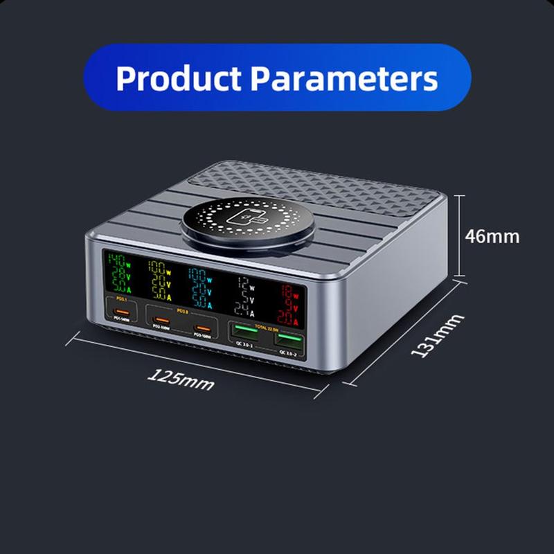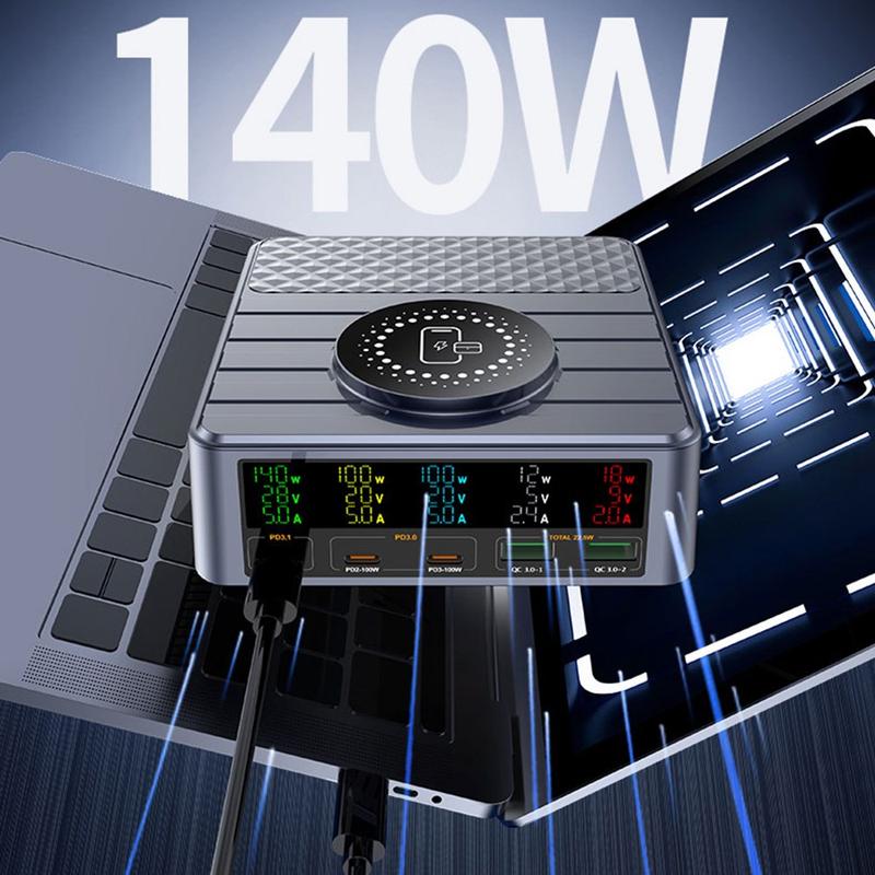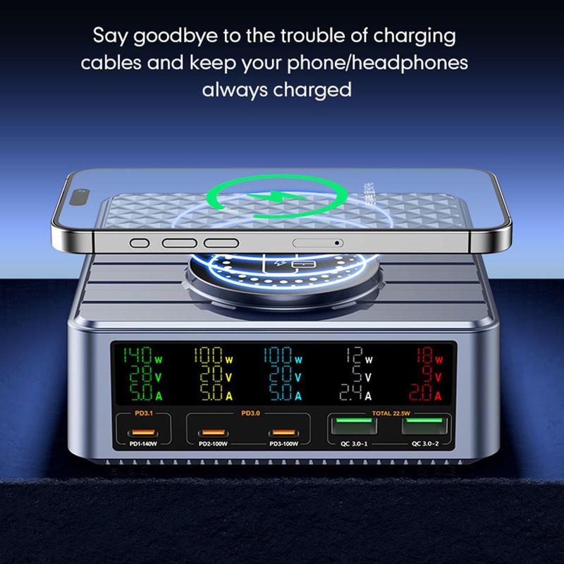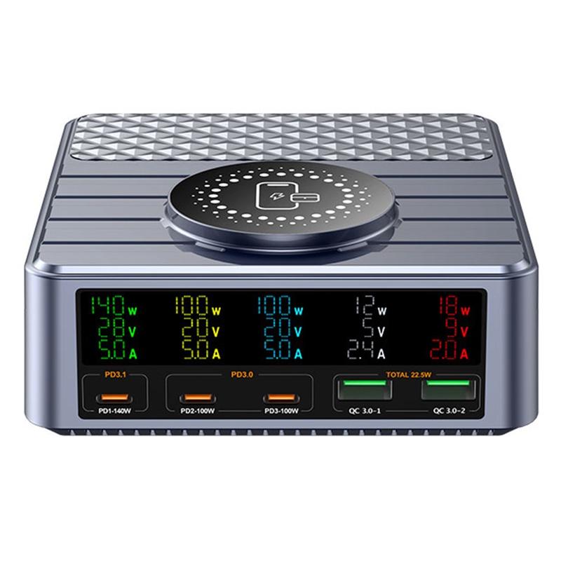 - Sześć portów ładowania: 2× PD, 3× QC, 1× bezprzewodowa podkładka ładująca