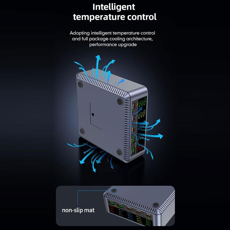 Wbudowany wyświetlacz cyfrowy zapewnia wgląd w czasie rzeczywistym w moc ładowania i stan portu, ułatwiając monitorowanie dystrybucji energii. Dzięki 9-warstwowej ochronie, ładowarka zapewnia bezpieczną i stabilną pracę wszystkich podłączonych urządzeń elektronicznych.
