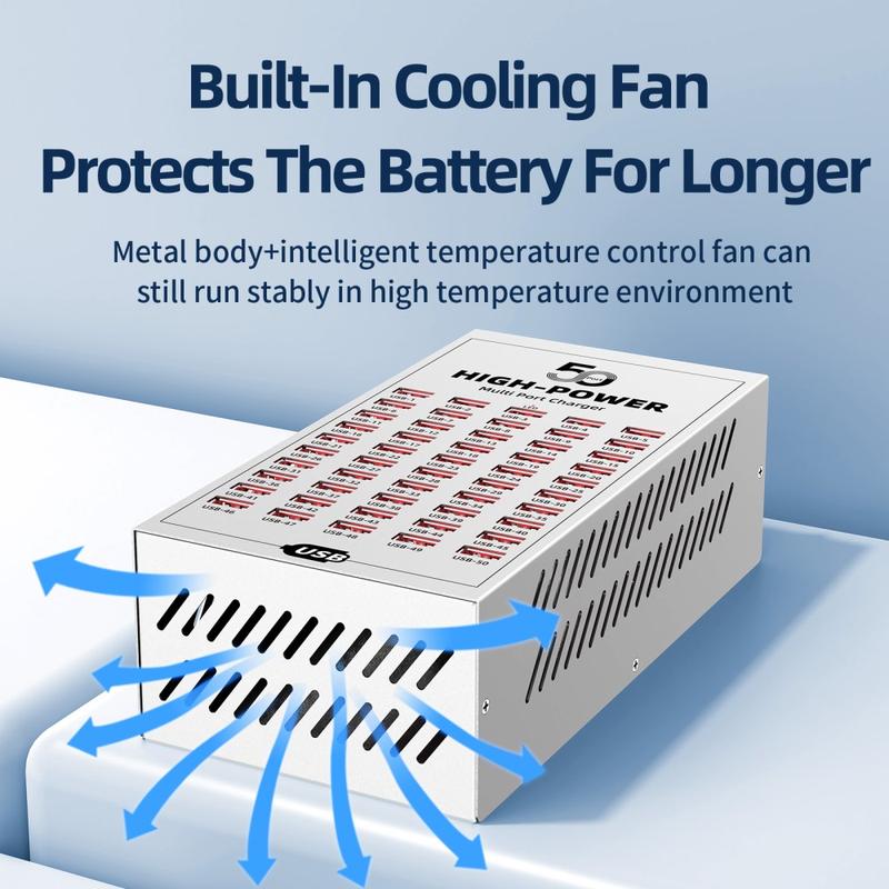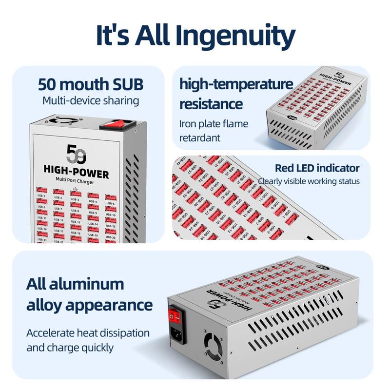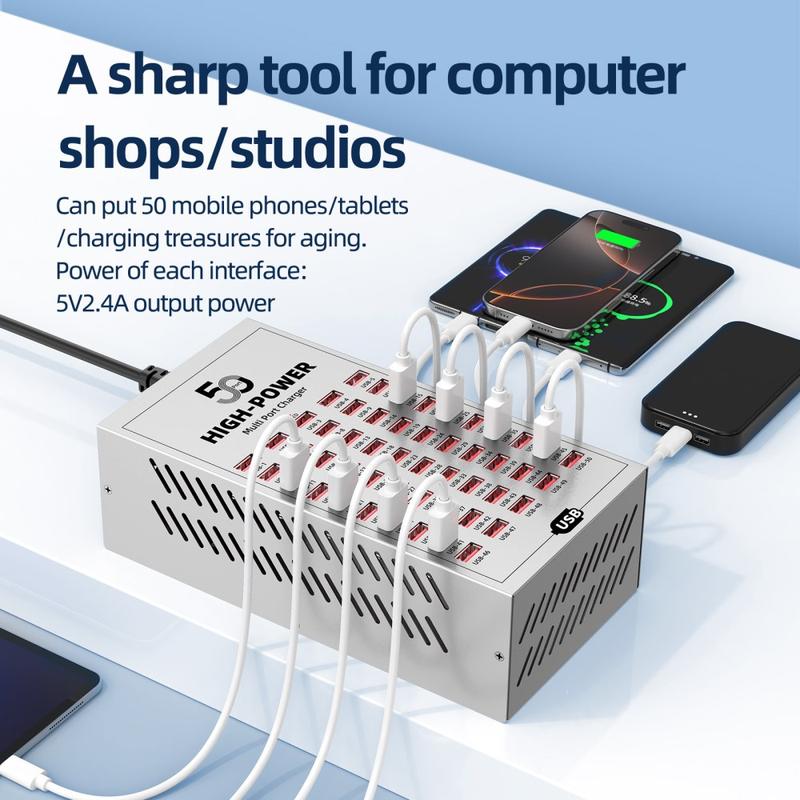 - 50 portów USB do jednoczesnego ładowania wielu urządzeń w środowiskach komercyjnych i przemysłowych
