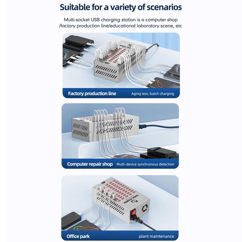 Zasil całą stację roboczą w jednym miejscu dzięki 50-portowej stacji ładującej USB WLX-T2A. Stworzona z myślą o środowiskach o wysokich wymaganiach, takich jak fabryki, laboratoria urządzeń, szkoły, magazyny i centra serwisowe, umożliwia jednoczesne ładowanie do 50 urządzeń, zapewniając stabilną wydajność i porządek. Każdy port USB obsługuje napięcie do 5 V/2,4 A, a urządzenie inteligentnie zarządza mocą wyjściową, aby zapewnić bezpieczne i wydajne ładowanie różnych typów urządzeń — telefonów, tabletów, skanerów, zestawów słuchawkowych i urządzeń testujących.