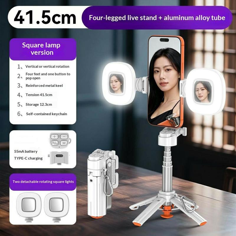 Samoczynnie rozkładane nogi statywu zapewniają szybką stabilność po rozłożeniu, a wysuwana konstrukcja i obrotowy uchwyt na telefon ułatwiają zmianę kątów i formatów ujęć. Dołączony pilot Bluetooth pozwala robić zdjęcia bez użycia rąk, a podwójne kwadratowe lampy wypełniające zapewniają dodatkową jasność podczas selfie, rozmów wideo i nagrań.
