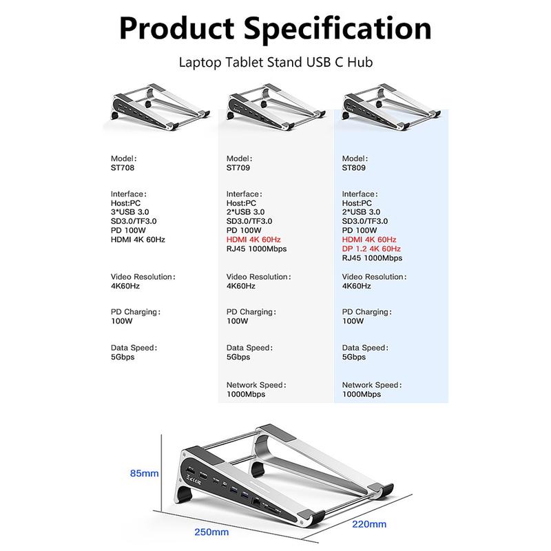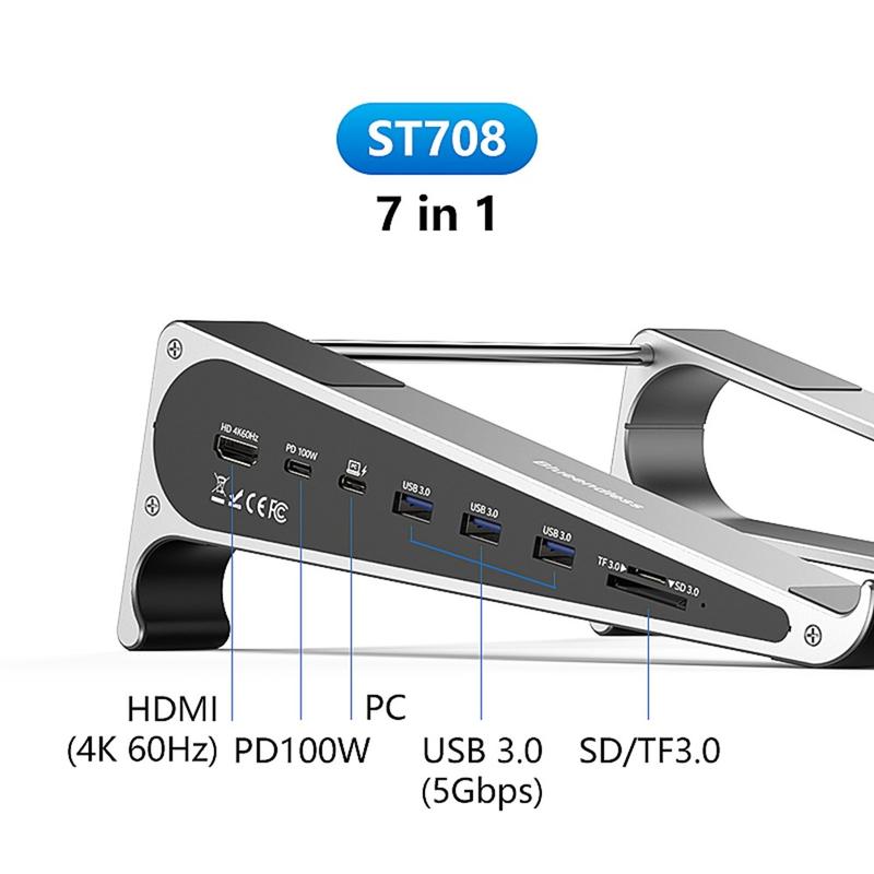 Stojak na laptopa Blueendless ST708 7 w 1 z hubem USB - 4K@60Hz HDMI, ładowanie PD 100 W, 3xUSB 3.0, czytnik kart TF, aluminiowa podkładka pod laptopa