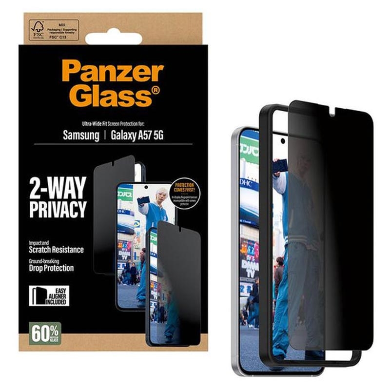 Pożegnaj się z wścibskimi oczami i przywitaj spokój ducha - szkło hartowane PanzerGlass Ultra-Wide Fit Privacy z EasyAligner do Samsung Galaxy A57 zabezpieczy Twoje prywatne wiadomości lub dane bankowe. Zapewnia również niezrównaną ochronę przed zadrapaniami, przypadkowymi uderzeniami i smugami dzięki hartowanemu szkłu na poziomie diamentu, opracowanemu przez PanzerGlass.