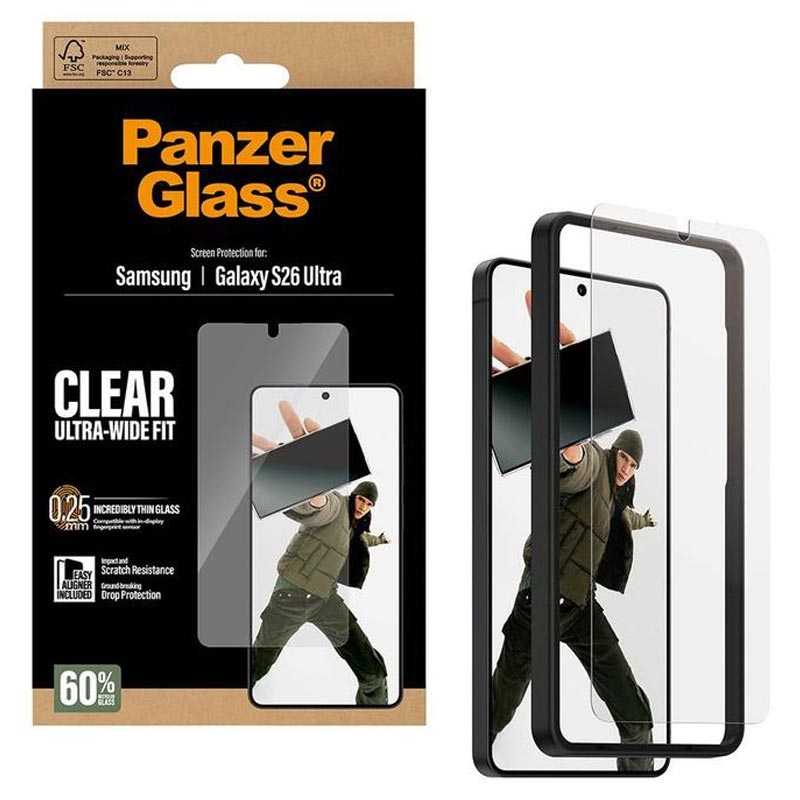 - Zabezpieczenie ekranu ze szkła hartowanego Ultra-Wide Fit do Samsung Galaxy S26 Ultra firmy PanzerGlass
