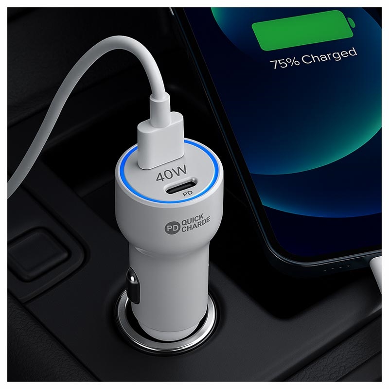 Ładowarka samochodowa z podwójnym portem USB-C o mocy 40 W zapewnia szybkie, wydajne i bezpieczne ładowanie podczas jazdy. Dzięki dwóm wyjściom PD, inteligentnej kontroli temperatury i kompaktowej, przyjaznej dla użytkownika konstrukcji, ładowarka zapewnia gotowość gadżetów do działania w każdym miejscu.