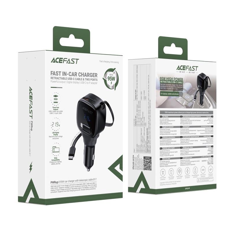 ACEFAST B17 łączy w sobie wydajność, praktyczność i wysokiej jakości design w jednym kompaktowym akcesorium. Chowany kabel eliminuje bałagan, wyświetlacz LED zwiększa świadomość ładowania, a moc 95 W zapewnia szybkie i niezawodne ładowanie szerokiej gamy urządzeń. Niezależnie od tego, czy dojeżdżasz do pracy, czy podróżujesz, jest to wartościowe ulepszenie dla każdego kierowcy.