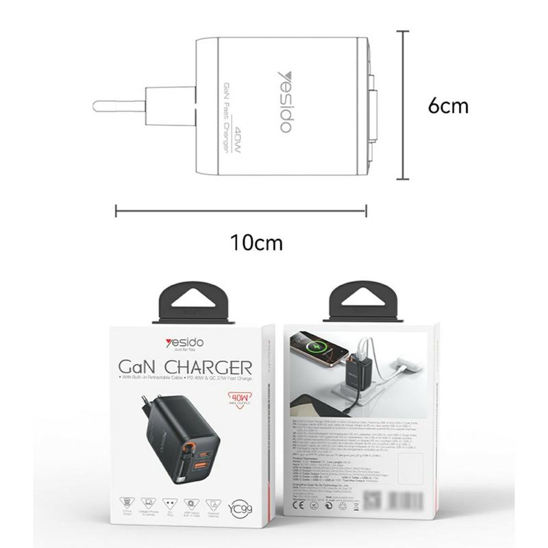 Szybka ładowarka Yesido YC99 40W ze zwijanym kablem typu C - adapter ładowania USB-A i USB-C GaN - wtyczka UE
