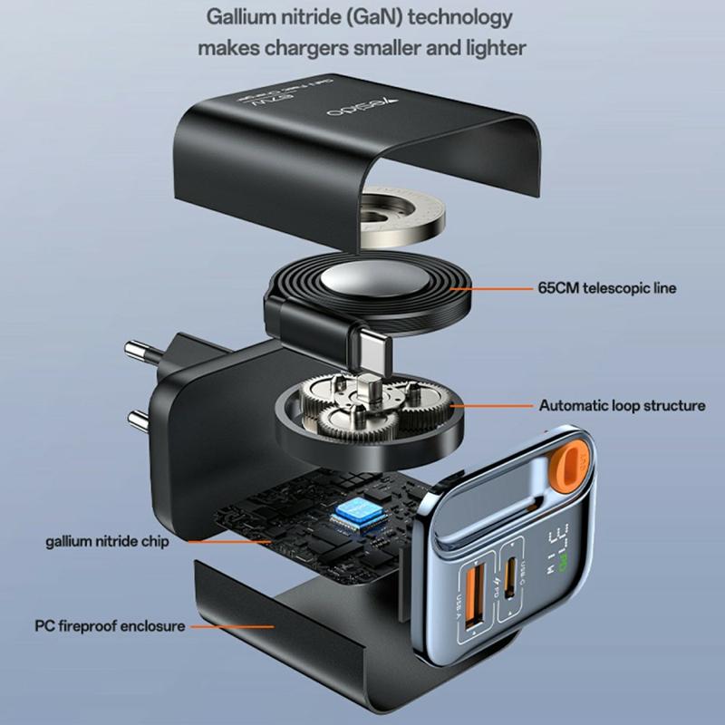 Szybka ładowarka Yesido YC100 67 W ze zwijanym kablem typu C - adapter ładowania USB-A i USB-C GaN - wtyczka UE
