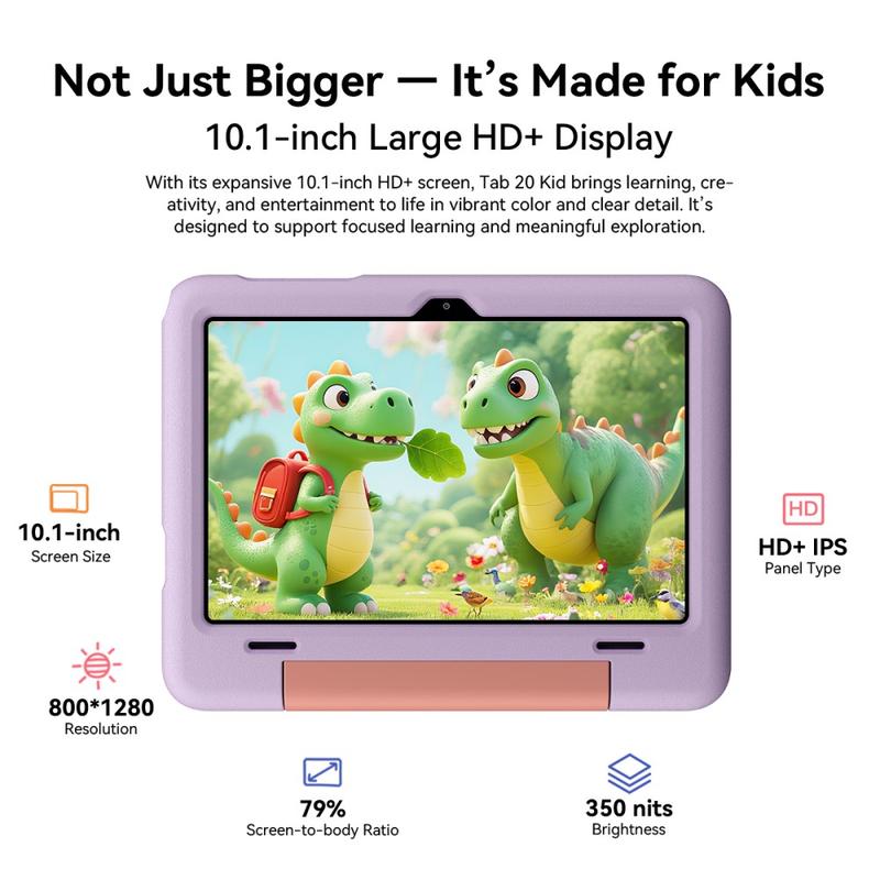 BLACKVIEW Tab 20 Kids posiada przestronny 10.1-calowy ekran IPS HD (800 × 1280), który zapewnia wyraźny obraz, dzięki czemu idealnie nadaje się do aplikacji edukacyjnych, filmów, kreatywnej nauki i rozrywki przyjaznej dzieciom.
