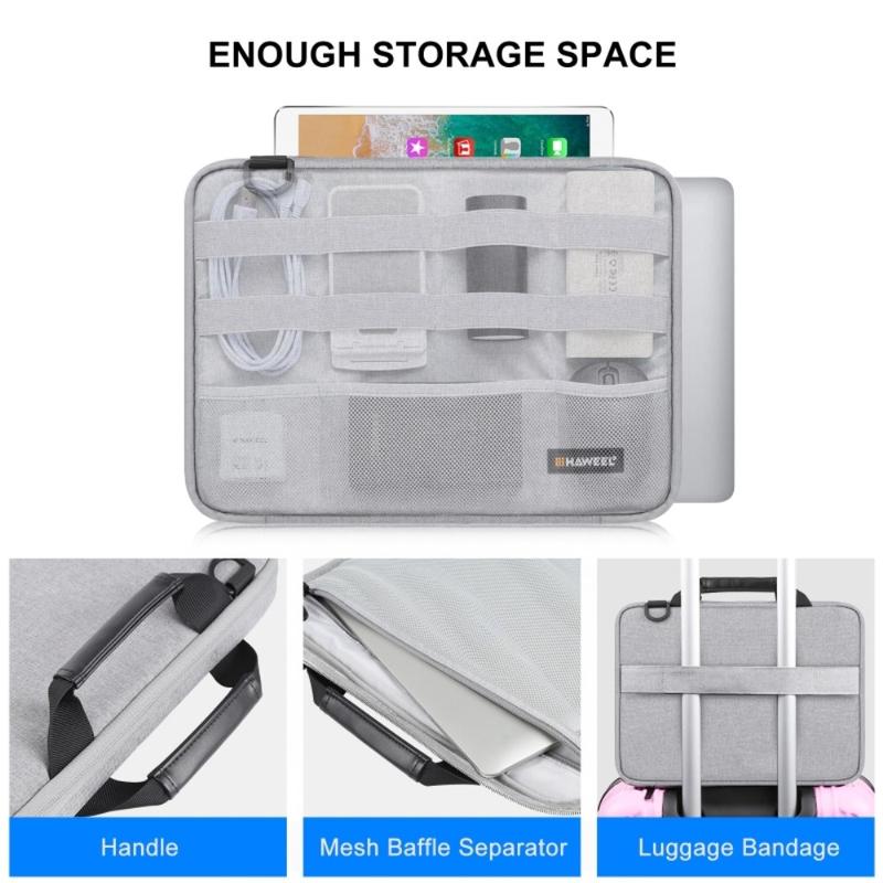 Bezpiecznie przenoś laptopa i podróżuj mądrzej dzięki torbie HAWEEL HWL2168 MacBook. Ta smukła, ochronna torba, zaprojektowana z myślą o laptopach o przekątnej od 14 do 15 cali, łączy w sobie wielowarstwową wyściółkę z praktyczną przegrodą na akcesoria, dzięki czemu możesz uporządkować wszystkie niezbędne rzeczy w jednym miejscu. Wodoodporna poliestrowa powłoka zewnętrzna chroni przed deszczem i rozlanymi płynami, a miękka wyściółka wewnętrzna zmniejsza ryzyko zarysowań podczas codziennych dojazdów do pracy, użytkowania w biurze i podróży.